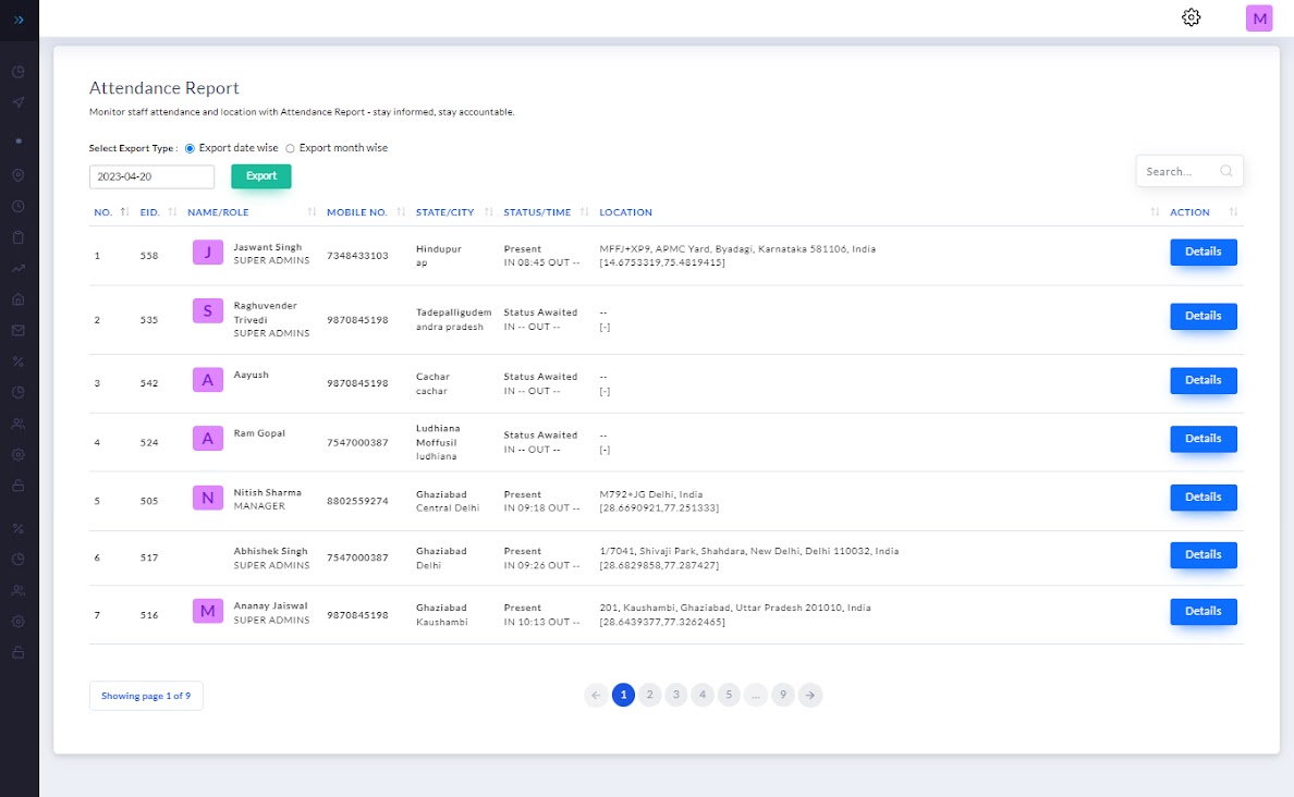 Here you can see the list of your employees and their details like from where they have punched-in their attendance. And when you click on this "**Details**" option which is in front of every users attendance record, you can refer the image mentioned below: